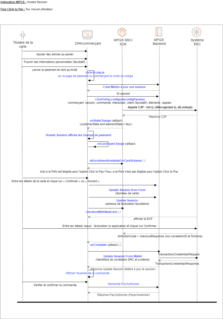 Les figures suivantes illustrent les flux liés aux trois scénarios. Pour plus d'informations sur la manière d'implémenter ces scénarios, voir Intégration Hosted Session Click to Pay.